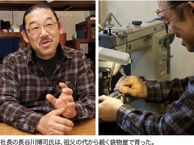 長谷川社長は、高校卒業後、いわゆる袋物業界に入った。実家(長谷川製作所)は、祖父の代から続く紳士財布のメーカー。3人兄弟の末っ子である長谷川氏は、2人の兄ともに家業を担ってきた。経営は兄、製品の企画や製造は弟(長谷川博司氏)が受け持った。時代は高度成長期。「永遠に右肩上がりが続くと錯覚した」ほど業績は好調だった。しかし、1980年代後半になると、安価な中国製品が市場を席巻。兄が経営する会社も、時代の流れに対応すべく、中国の提携工場に生産を委託するようになった。