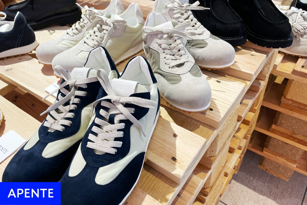 靴のカテゴリーには「APENTE」と「KUTSUNE」の2つのブランドが出店しました。「APENTE」はフィット感の高い木型や丁寧な縫製、遊び心のあるモダンかつミニマルなデザインで定評のあるブランド。シグネチャーアイテムの、取り外し可能のタッセルチャーム付き2WAYスニーカーは、コロンとした丸みのあるトゥと細身の足形が大好評でした。見ているだけで心が弾むデザインと履き心地の良さに定評がある「KUTSUNE」は、新作のスニーカーをアピール。バスクウール(丈夫で目が詰まったウール)を用いたスニーカーは注目の的でした。革靴が持つデザインの良さとスニーカーが持つ履き心地と使いやすさを兼ね備えた靴は多くのファンを獲得したようです。