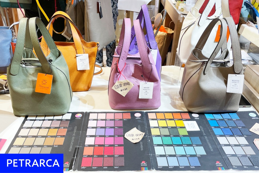 看板アイテムのキューブ型本革バッグを前面に打ち出したのが「PETRARCA」。100色以上もの革の中から好みの色を選べるカスタムオーダーサービスのコーナーでは、お気に入りの色をチョイスするひとときを笑顔で楽しむお客様が多く見られました。