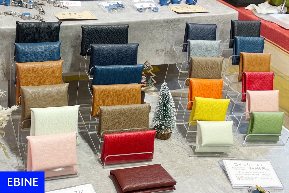 「EBINE」では、小銭入れやミニ財布などマルチに使えるコインケースが大好評。コンパクトなサイズながら、お札やカードもスムーズに収まるアイテムです。シンプルなデザインと機能美はお客様に高く評価されていました。