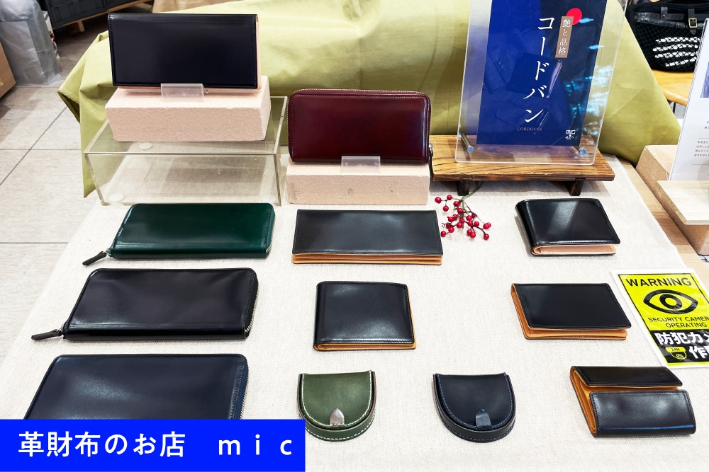 「革財布のお店 mic」では、カラフルなキーホルダーやペンホルダーのほか、グレージングと水性染料のみで仕上げられたコードバン製の財布も注目の的。コードバンの独特な透明感と深い色合いは、長く愛着を持って使える一品を探しているお客様の心に刺さったようです。