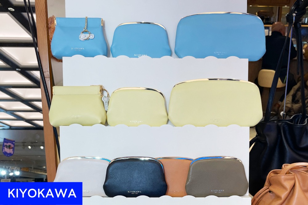 エレガントなクラッチ風長財布で独特の存在感を放っていたのが「KIYOKAWA」。優しい色合いの革とゴールドの金具が上品にマッチした仕上がりに足を留め、商品に手を伸ばすお客様がたくさん!薄型のスリムなデザインも好評を博しました。