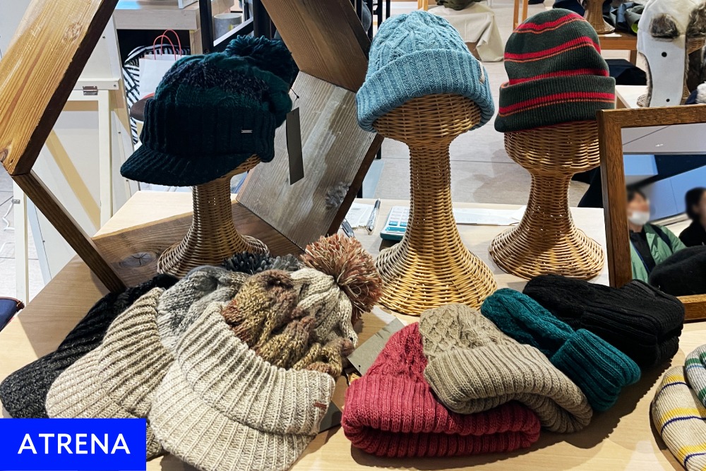 帽子のカテゴリーでは、「ATRENA」と「NAMIKI chapelière/マルコ帽子店」の2ブランドが会場を華やかに彩りました。「ATRENA」は着用する人の個性を際立たせるデザイン性とフィット感の高さで多くのファンを持つブランド。季節柄、ふっくらとした可愛い編柄や耳当て付きのウールのニット帽が人気を集めました。いずれも寒い冬を楽しく温かく演出する、大人のためのチャーミングなニット帽です。