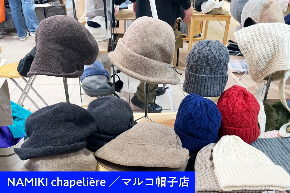 一方、「NAMIKI chapelière/マルコ帽子店」のブースでお客様の支持を得ていたのは、さまざまなアレンジが楽しめるクロッシェタイプのウールバスクフード。帽子が持つ季節感とファッションの奥深さを感じさせるラインナップでした。